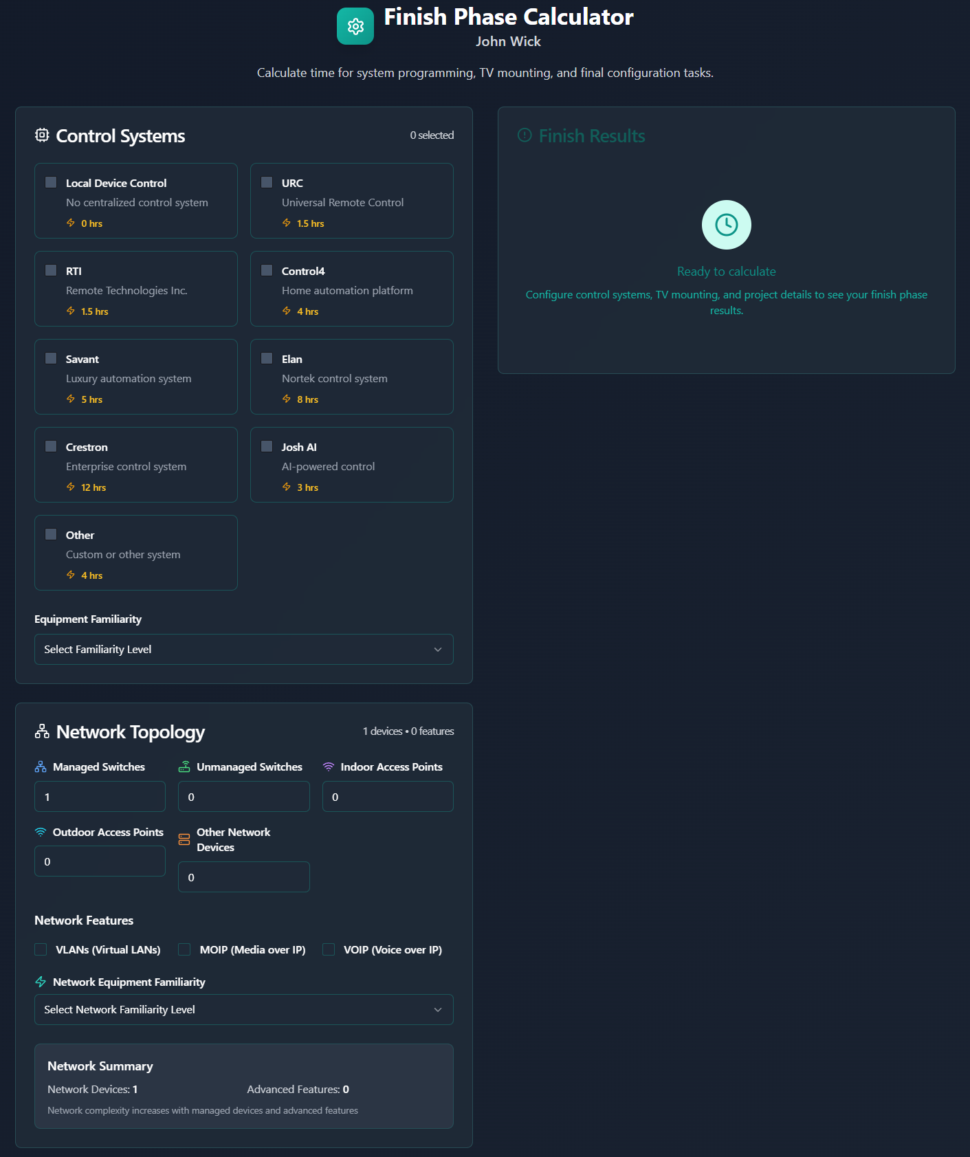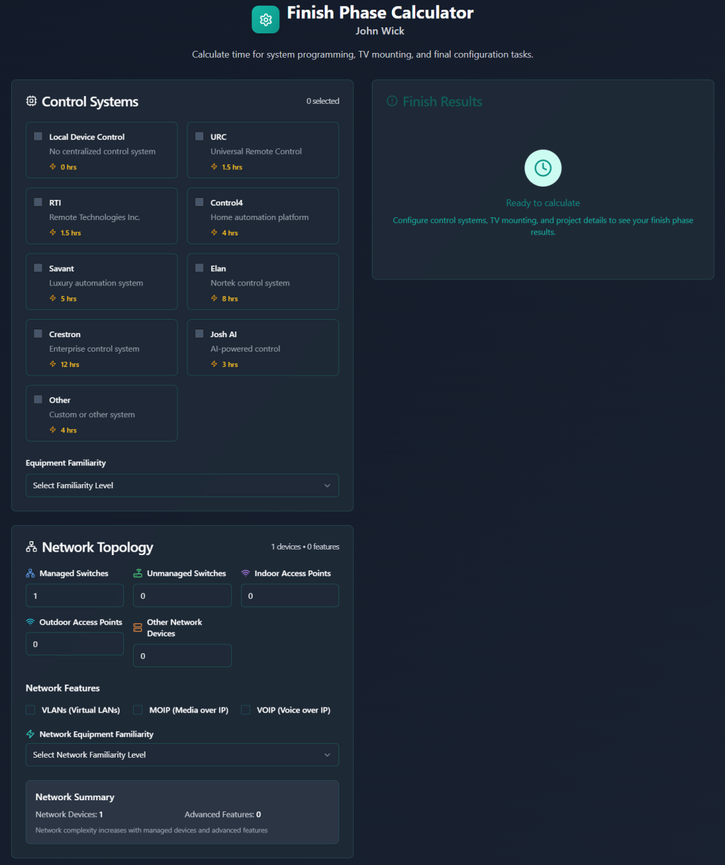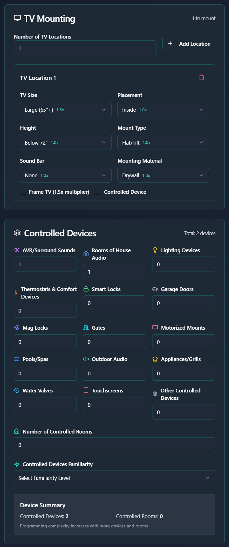 Estimate programming and installation time based on control system type, network info, TV mounting, security systems, and site conditions/client preferences.