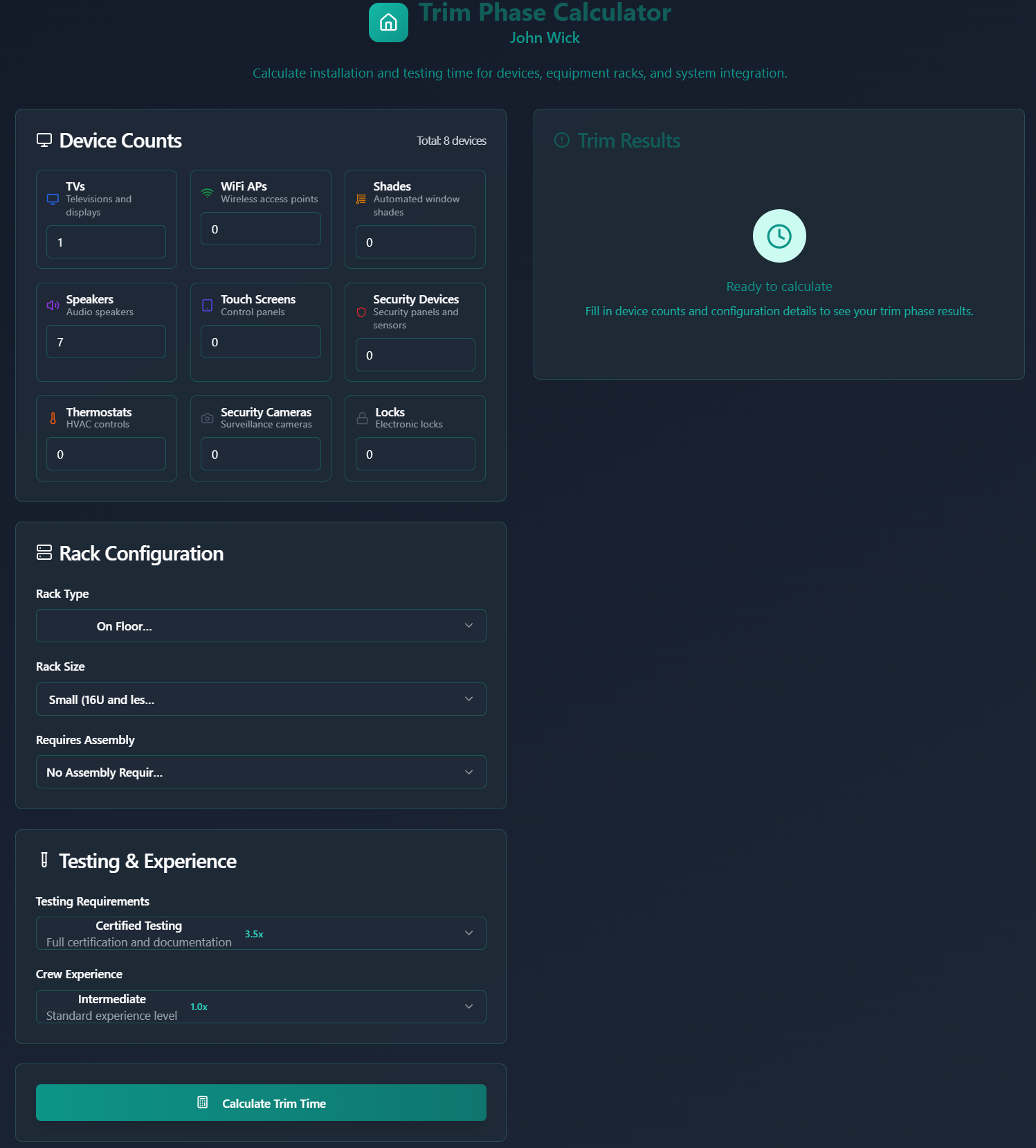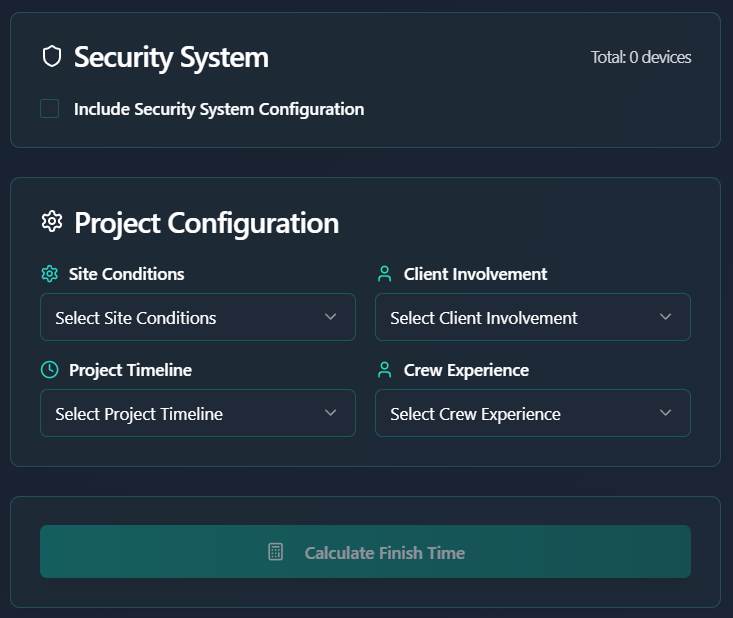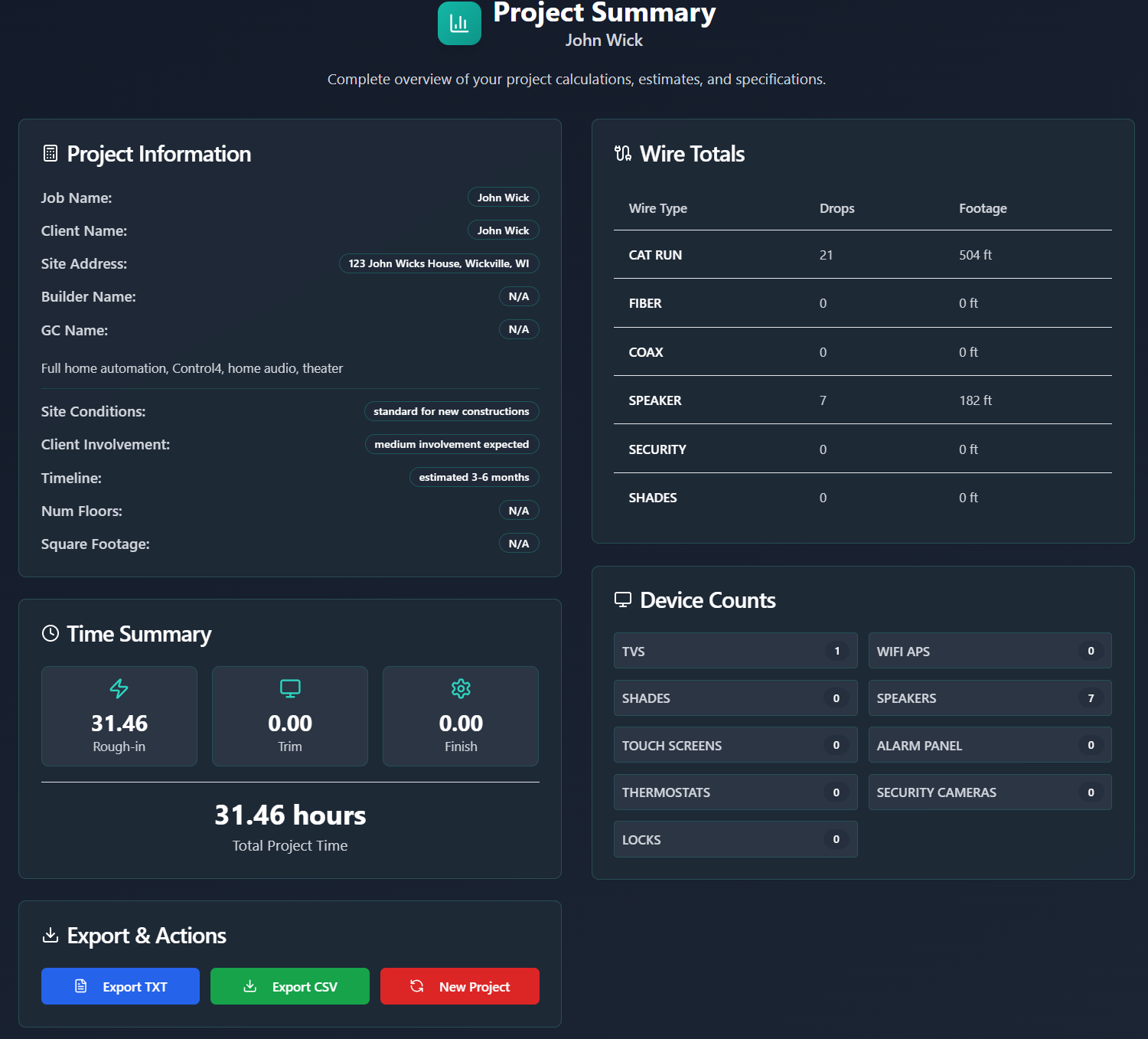 Estimate programming and installation time based on control system type, network info, TV mounting, security systems, and site conditions/client preferences.