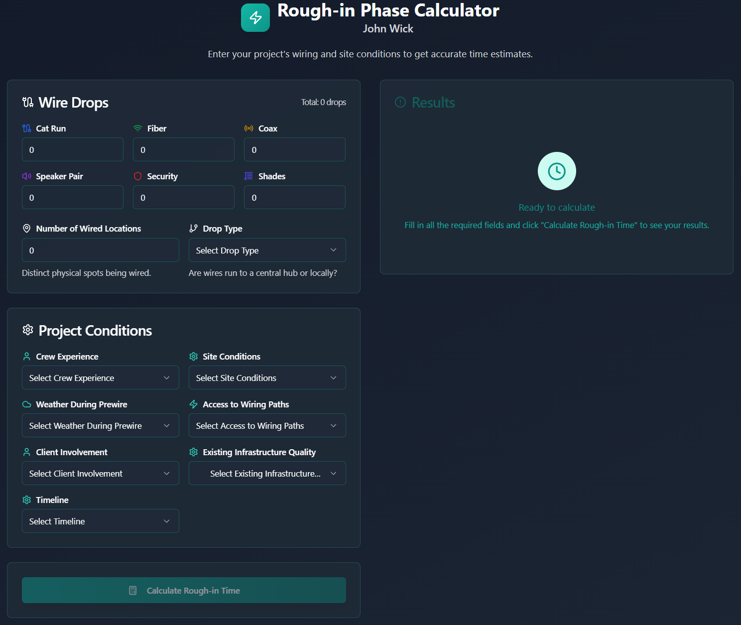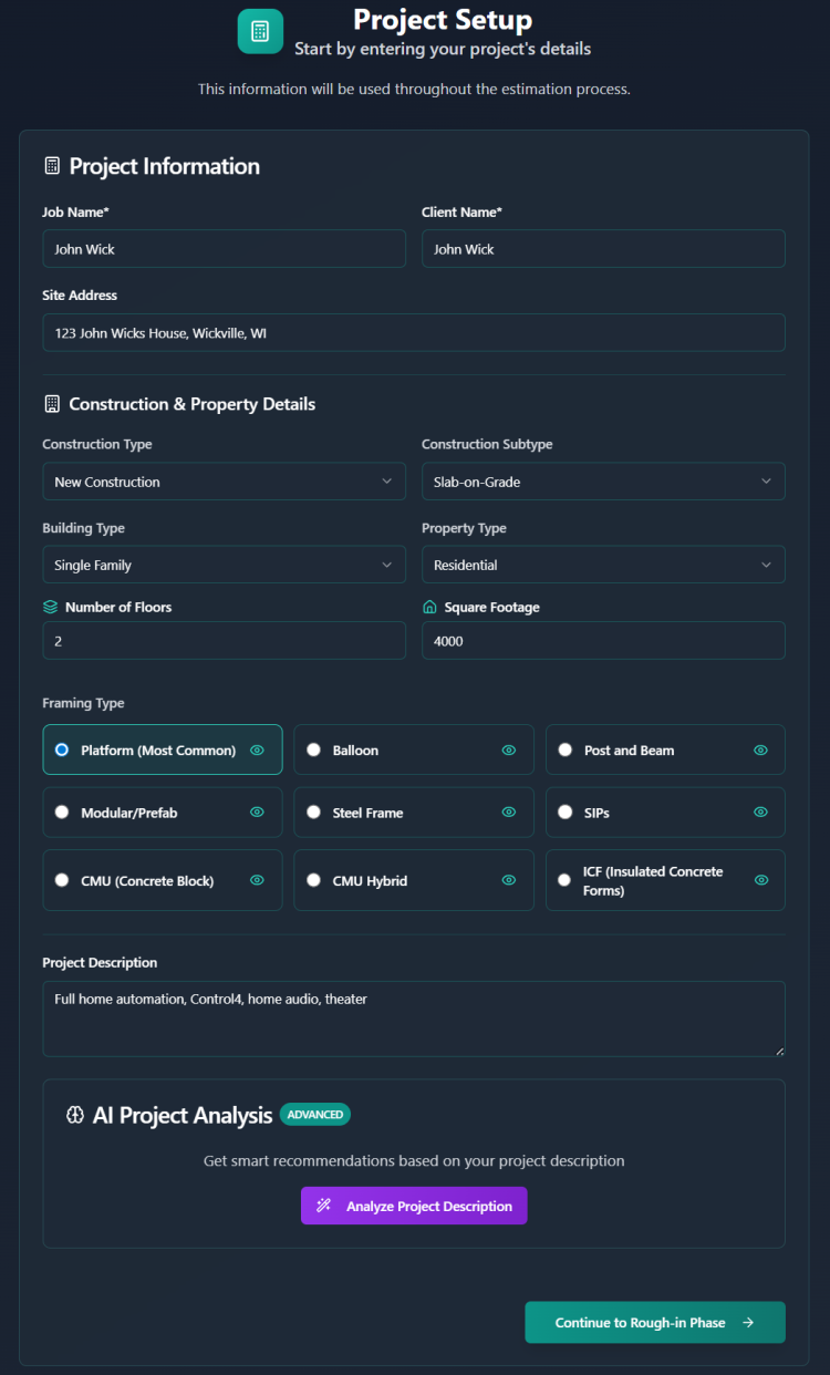 Deliver precise time estimates for the rough-in phase, with options to select framing types (complete with example pics), adjusted for weather conditions.